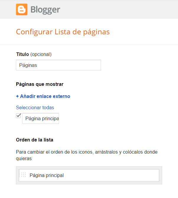 Buscaremos un gadget que se llame "Páginas" y lo seleccionaremos. A continuación nos pedirá que especifiquemos un título (opcional), las páginas a mostrar mediante unos checkbox y un orden.